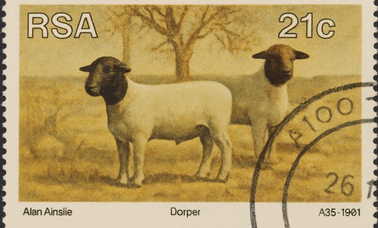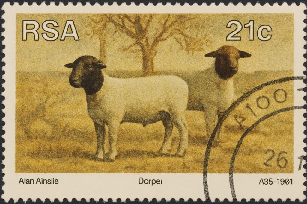Según el catálogo Colnect, desde 1913 Sudáfrica ha emitido 4.467 estampillas, de las cuales solo cuatro están dedicadas a los ovinos. Una de ellas, emitida en 1991, tiene un valor facial de 21 céntimos e ilustra dos carneros Dorper de perfil robusto y cabeza negra, sobre un paisaje típico de la sabana sudafricana. Esta pieza forma parte de una serie de cinco valores titulada “Animal Breeding in South Africa”.