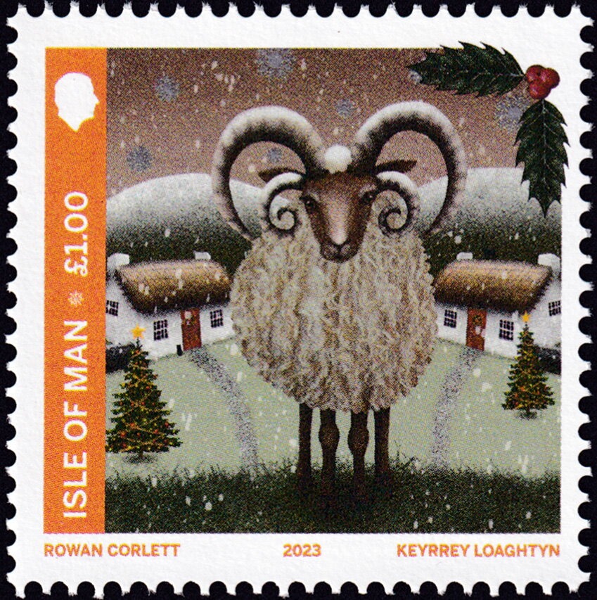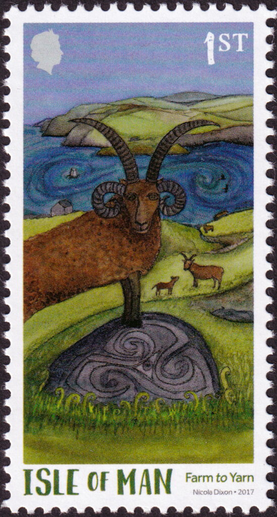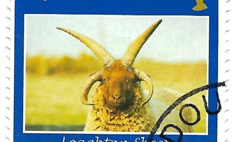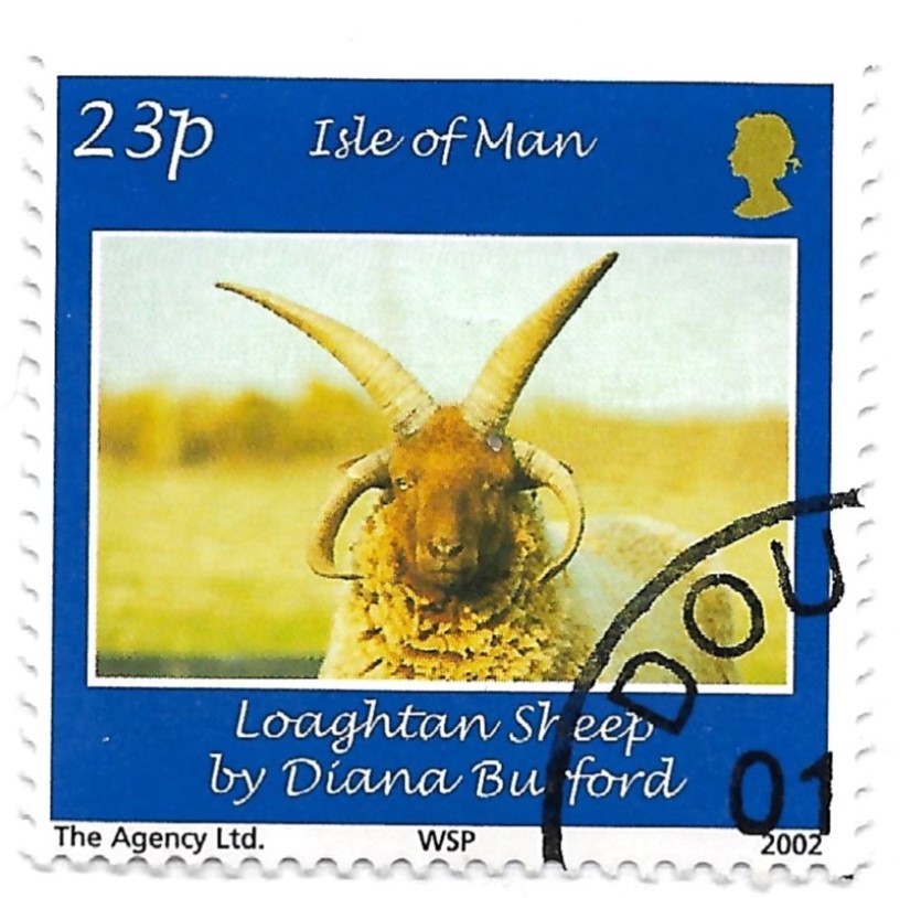 Emitida en 2002 por la autoridad postal, la Isle of Man Post Office, la estampilla —de formato cuadrado, 32 x 32 mm— muestra a un carnero de la raza Manx Loaghtan, una especie ovina autóctona reconocida por su singular cornamenta de cuatro cuernos, rasgo que la hace única y muy apreciada por los criadores locales.