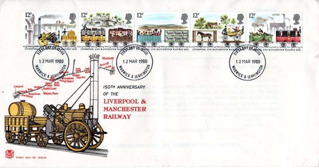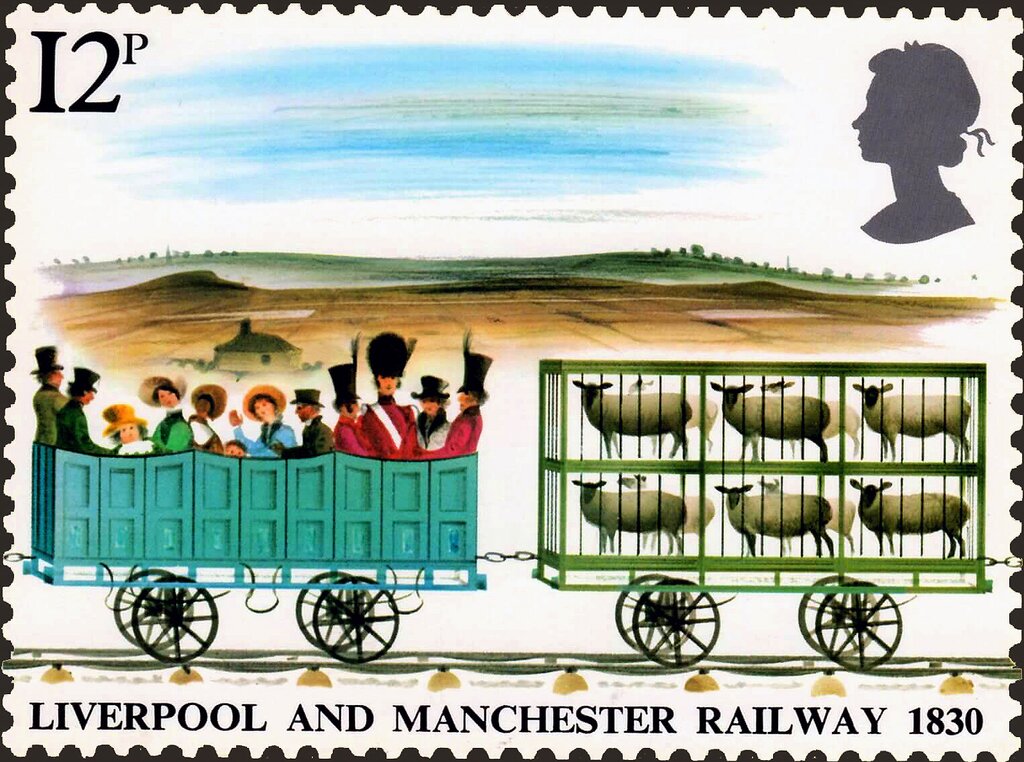 La estampilla emitida 12 de marzo de 1980 por la autoridad postal del Reino Unido —catalogada como GB 928 en Yvert & Tellier— muestra un tren de pasajeros acoplado a un vagón que transporta ovinos. Con dimensiones de 41 × 30 mm, fue diseñada por David Gentleman e impresa por Harrison & Sons Ltd., con un amplio tiraje de 23 000 000 de ejemplares.