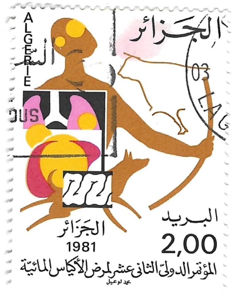 Desde 1899 han circulado en Argelia un total de 2.849 estampillas, de las cuales apenas cuatro incluyen imágenes relacionadas con ovinos. Una de ellas es la emitida el 23 de abril de 1981, con motivo del XII Congreso Internacional de Hidatidología. Con un tamaño de 33 × 43 mm, esta estampilla presenta una silueta animal de trazo esquemático, que puede interpretarse como un ovino —reflejo de la importancia de la cría de ovejas en el país y su papel central como huésped intermediario en el ciclo epidemiológico de la hidatidosis.