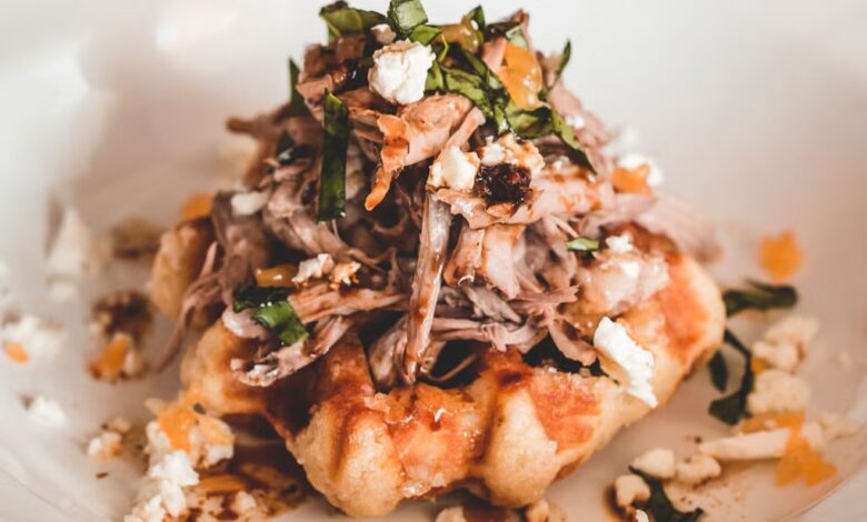 Sobre un gofre, ponemos una buena cantidad de carne y cortamos en tiras las hojas de albahaca fresca y se esparcen sobre ella. Posteriormente, desmigajamos con los dedos un trozo de queso feta.