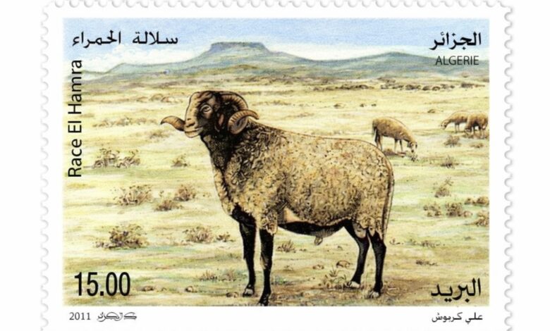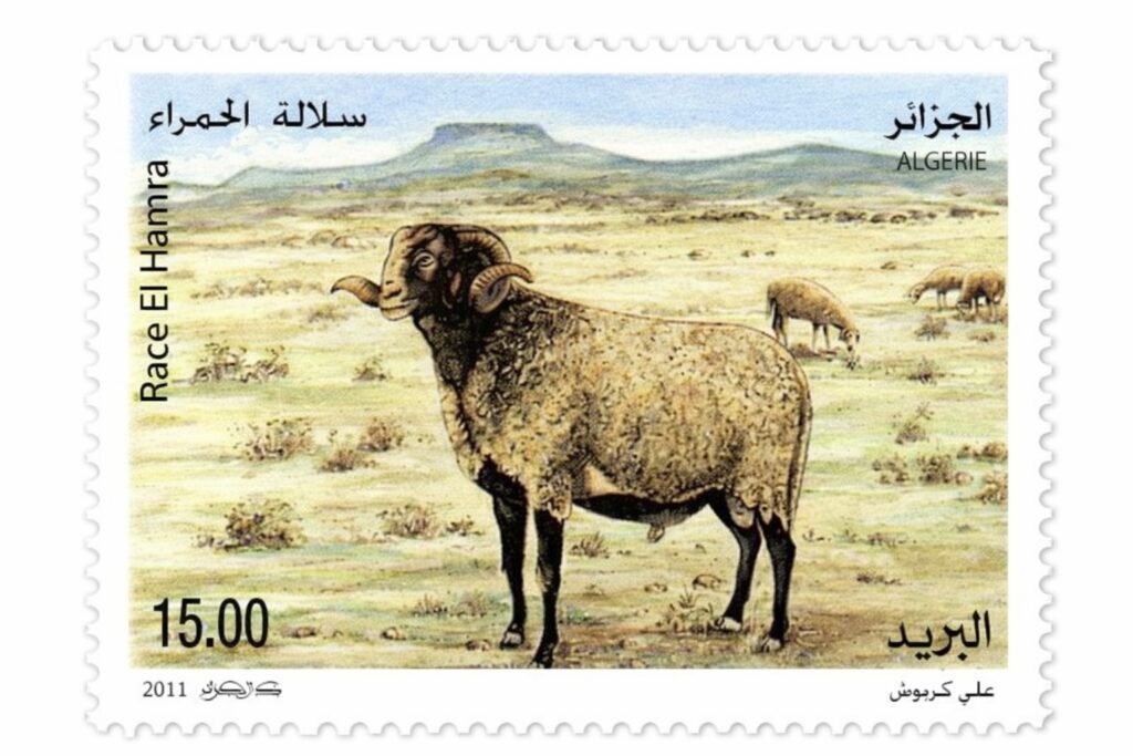 La estampilla combina tres lenguas —árabe, francés y caracteres latinos—, reflejando la identidad cultural y administrativa de Argelia, y pone en primer plano a la raza El Hamra como símbolo de la ganadería ovina pastoril en ambientes áridos y semiáridos.