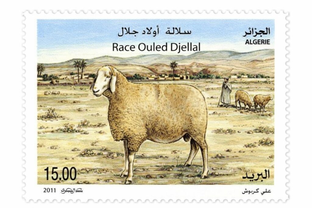 La estampilla dedicada a la oveja Ouled Djellal, una de las razas ovinas más importantes y difundidas del país, fue emitida en 2011. Muestra un ejemplar de gran talla, lana blanca, cabeza alargada y orejas caídas, en un paisaje estepario semiárido característico de las Altas Mesetas argelinas. La raza es reconocida por su excelente aptitud cárnica, rusticidad y gran capacidad de adaptación a climas secos y a marcadas amplitudes térmicas.