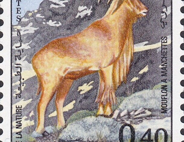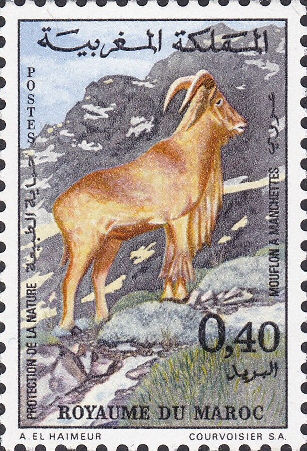 En 1972, Marruecos emitió su segunda estampilla con temática ovina, dedicada a un muflón de las montañas (Ammotragus lervia), conocido en francés como Mouflon à manchettes, representado de perfil sobre un paisaje rocoso típico de su hábitat natural en el Atlas. En la parte superior aparece la inscripción en árabe con el nombre oficial del país, mientras que en la base se lee “ROYAUME DU MAROC”. A la izquierda figura verticalmente la leyenda “PROTECTION DE LA NATURE”, que indica el carácter conservacionista de la emisión, y a la derecha el nombre común del animal.