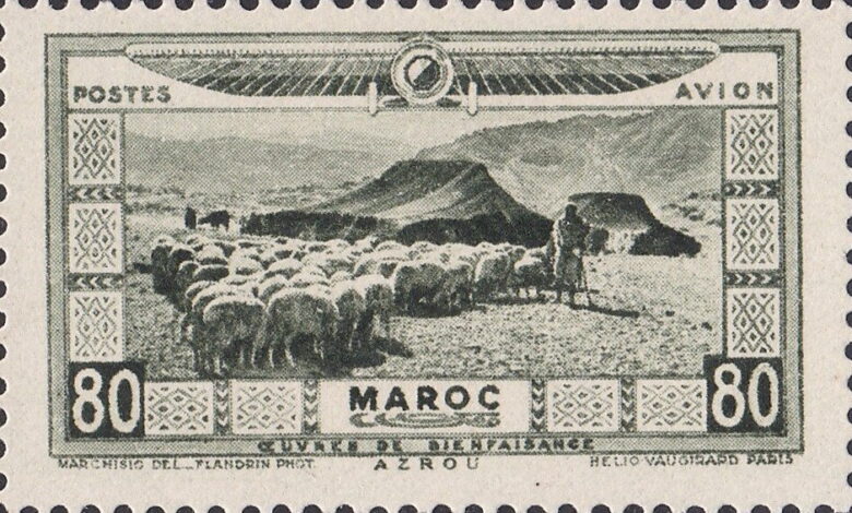 Según el catálogo filatélico Colnect, desde 1891 han circulado en Marruecos 2.939 estampillas postales, de las cuales solo dos están dedicadas específicamente a los ovinos. La primera, emitida el 26 de julio de 1928 y catalogada por Yvert & Tellier como MA PA16, muestra un pastor con un gran rebaño de ovejas en primer plano, delante de un paisaje montañoso característico de la región del Medio Atlas.